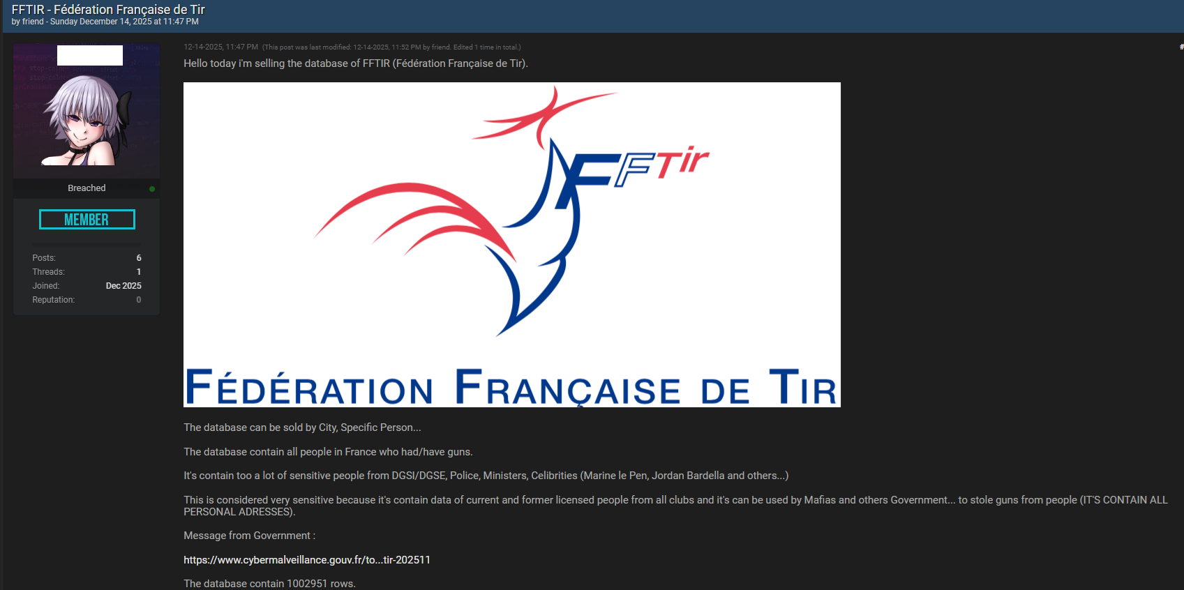 En décembre 2025, la base de données de la Fédération Française de Tir a fuité : plus d’un million de détenteurs d’armes avec noms, adresses complètes, téléphones et emails. Parmi eux : des agents DGSI/DGSE, des policiers, des personnalités politiques.